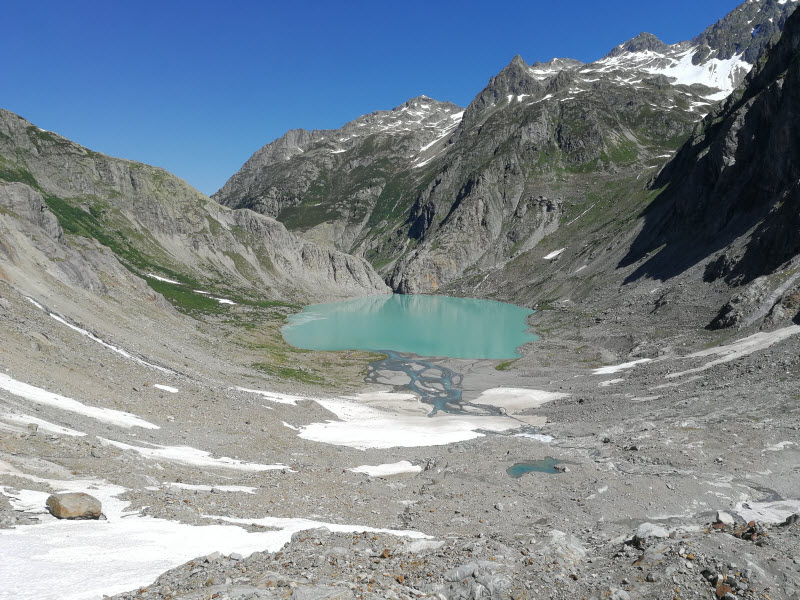 Am 5.7.2025 haben sich rund 20 Menschen im Gletschervorfeld Unteraar eingefunden. Einige der Teilnehmenden haben eine Nacht in der Lauteraarhütte verbracht und sich dem Gletscherweib vom Gletscher her genähert. Dabei durchliefen sie die frisch entstandenen Flächen, die neben viel Blockgelände zahlreiche Sand- und Kiesflächen und Tümpel aufweisen. Man darf sich auf die weitere Entwicklung freuen.