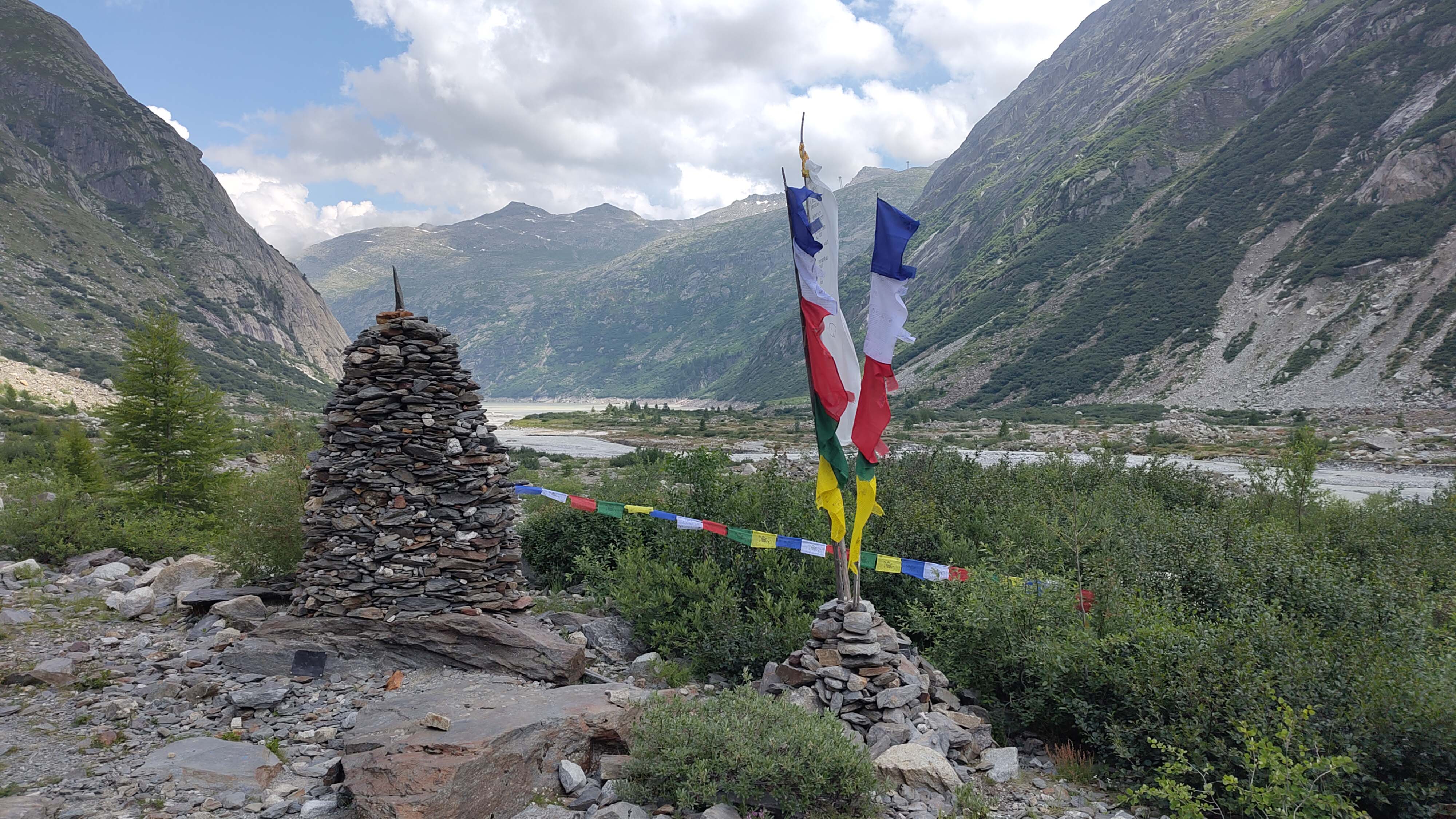 (Ende Juli 2025)Gletscherweib 2025Das Gletscherweib steht wieder frisch geschmückt und stolz in der prachtvollen Ebene der Unteraar und markiert den Widerstand gegen die Zerstörung dieser Landschaftsperle.