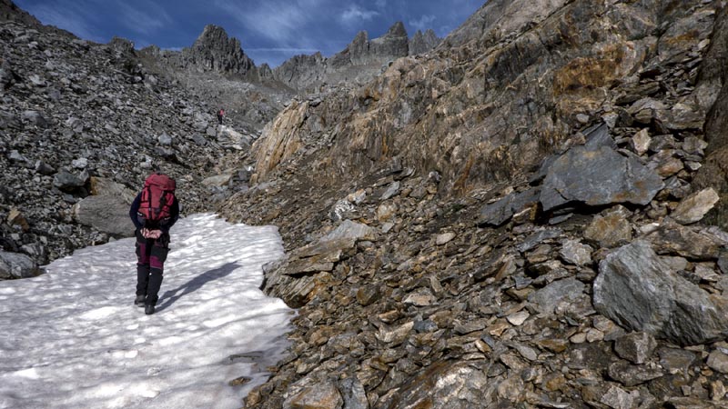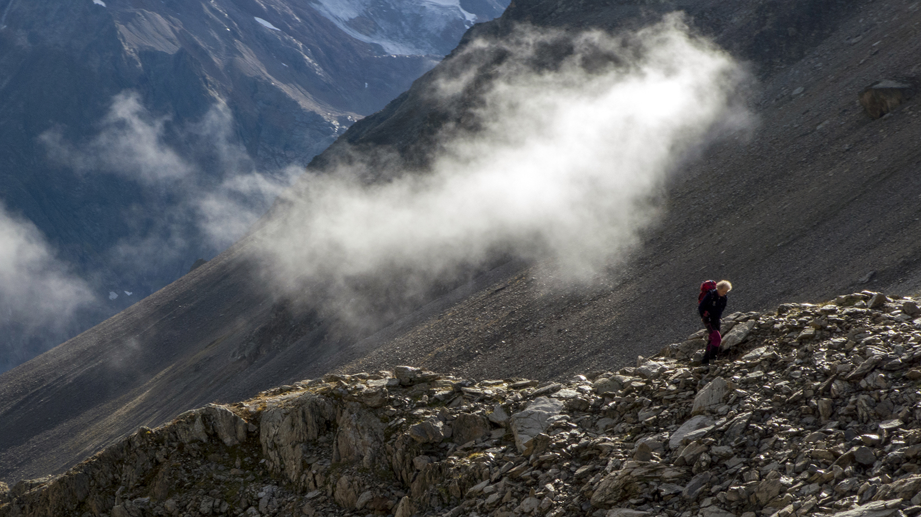 Am Samstag zogen wir weiter durch das Tal, über den Bächligletscher und hoch zur Oberen Bächlilicken. Nach einer kurzen Abfahrt ins Hiendertällti folgte der zweite Aufstieg zum Hubelhorn. Eine grossartige Aussicht erwartete uns, aber auch viele Leute, die kaum alle auf dem schmalen Gipfel Platz fanden.