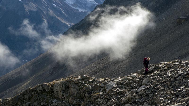 An Samstag starteten wir bei zweifelhaftem Wetter Richtung Giglistock. Das Wandern durch die tiefverschneiten Ebenen des Steinsees und des Umpols hatte etwas Magisches. Weiter auf dem Steinlimigletscher mussten wir angesichts des einsetzenden Schneefalls und der angespannten Lawinensituation dann allerdings umkehren. Zurück ging’s zum Hotel Steingletscher und weiter nach Gadmen. Dabei